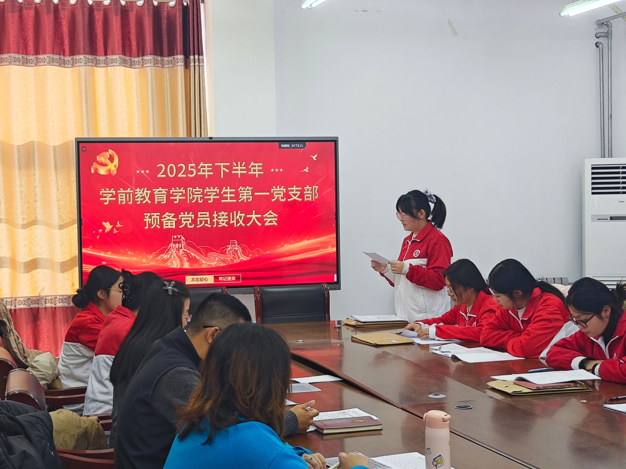 在深入贯彻落实立德树人根本任务、全面加强新时代高校基层党组织建设的关键阶段,为持续强化学生党员思想淬炼与实践锻造,不断优化党员队伍结构,推动党员发展工作提质增效、规范有序,2025年12月5日上午,学前教育学院学生第一党支部、第二党支部分别于会议室和二教B316召开2025年下半年预备党员接收大会。