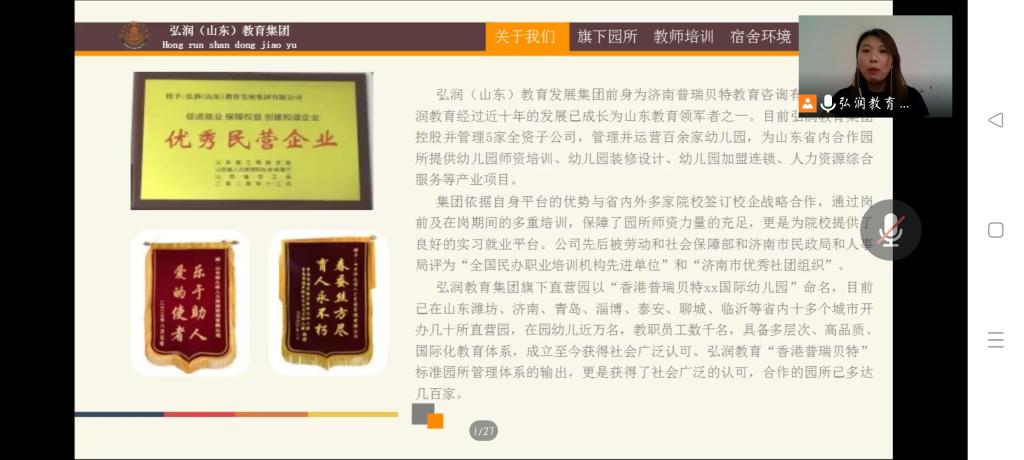 宣讲会上,郭燕老师从弘润集团教育宗旨理念、服务管理理念、园区环境、人才培养、未来发展、薪资待遇等多个方面进行了展示和详细宣讲,帮助同学们深入了解该集团企业,更加清楚就业信息。通过此次宣讲会,毕业生了解了幼儿园前沿的就业情况与信息,对于未来有了更明确的目标,收获了许多求职经验
