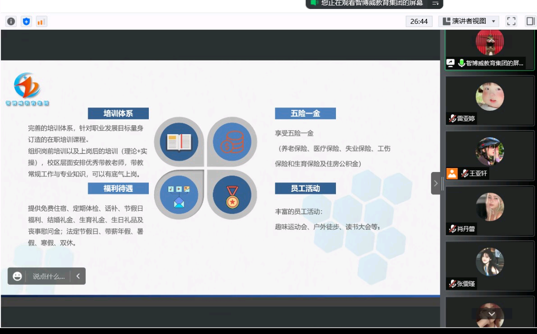 我院本着减轻就业负担,共创和谐社会的理念,积极为毕业生寻找就业岗位,以拓宽其就业渠道,于2022年12月3日下午三点半在线上召开“就选山东,情留齐鲁—齐鲁师范学院2023届毕业生网络双选会”,本次会议由教师孙超越主持,全体毕业生辅导员教师和预毕业生参加会议。本场双选会邀请的优质企业代表老师是来自山东智博威教育科技集团的柏晨老师。
