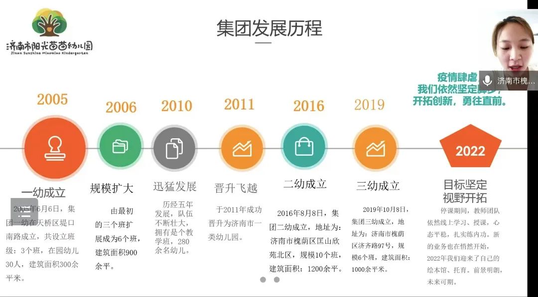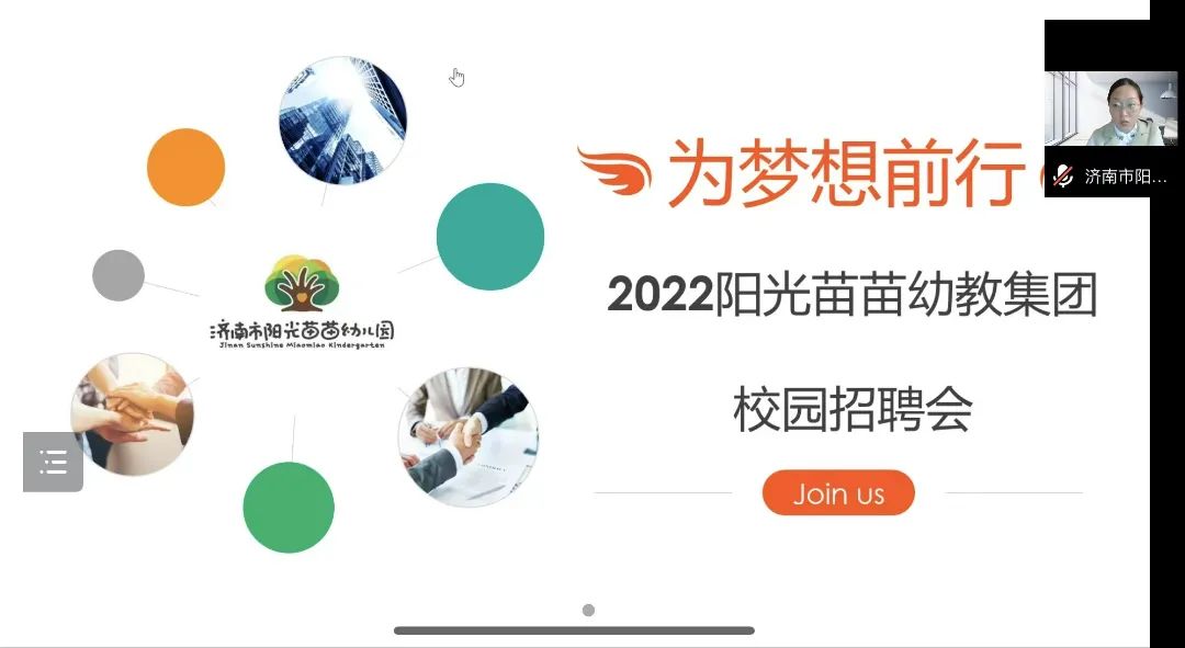 为促进毕业生高质量就业,加强对毕业生就业的指导与帮助,2022年4月30日上午10:00,学前教育学院邀请济南市阳光苗苗幼教集团创始人冯芊烨老师及各园园长为毕业生进行线上幼教就业宣讲。我院党委副书记孙建凯主持本次宣讲会,我院团总支书记郭飞,教师刘肖君、臧悦怡出席本次宣讲会,2018级全体学生参加本次宣讲会。