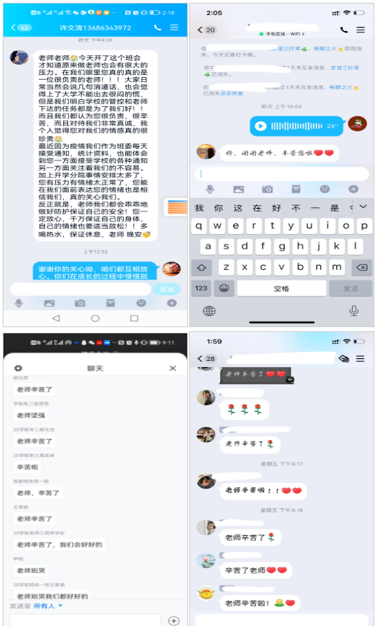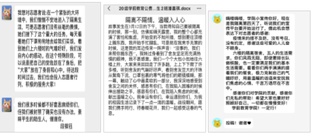 “老师,同学,你们辛苦了!”“老师,同学,你们也注意休息!”“老师,同学,有你们真好!”……这些话语来自学生的支持与肯定,也是学院师生共同做好防控工作的最大动力。辅导员、志愿者无私的付出和隔离人员温暖的话语,便是大爱,情暖你我。