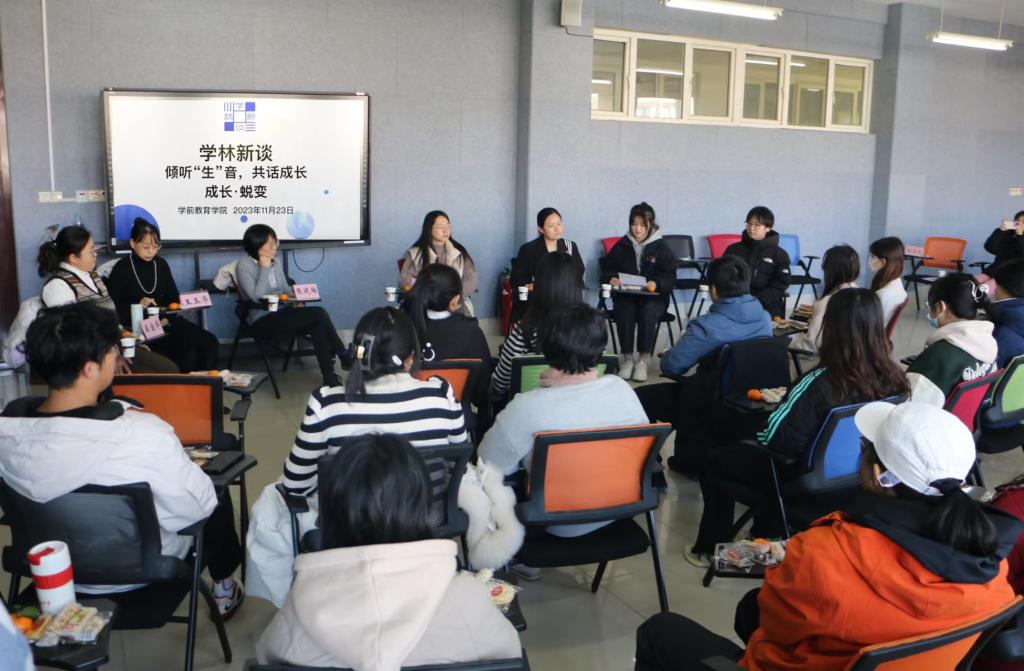 为促进师生间相互了解,让学生更好地了解所学专业、培养职业道德,让教师更好地掌握学生的成长情况,实现信息的双向沟通,在师生互动中体验全新教育模式,我院于2023年11月2日起,由学习秘书委员会组织举办了学前教育学院“倾听‘生’音,共话成长”学林新谈系列活动。继上次活动顺利举行,师生反响良好,11月23日14:30,本系列活动再次开展,学院各学科老师和各班级的学生汇聚一堂,共话学业、共话成长、共话未来。教师张晓梅、王玉华、王宝华出席本次活动,学前教育学院2020级优秀学生代表岳秀洁、2021级优秀学生代表高威、曹慧超及2022级各班的学生代表参与本次活动。此次活动由学前教育学院团总支副书记田蕾主持。