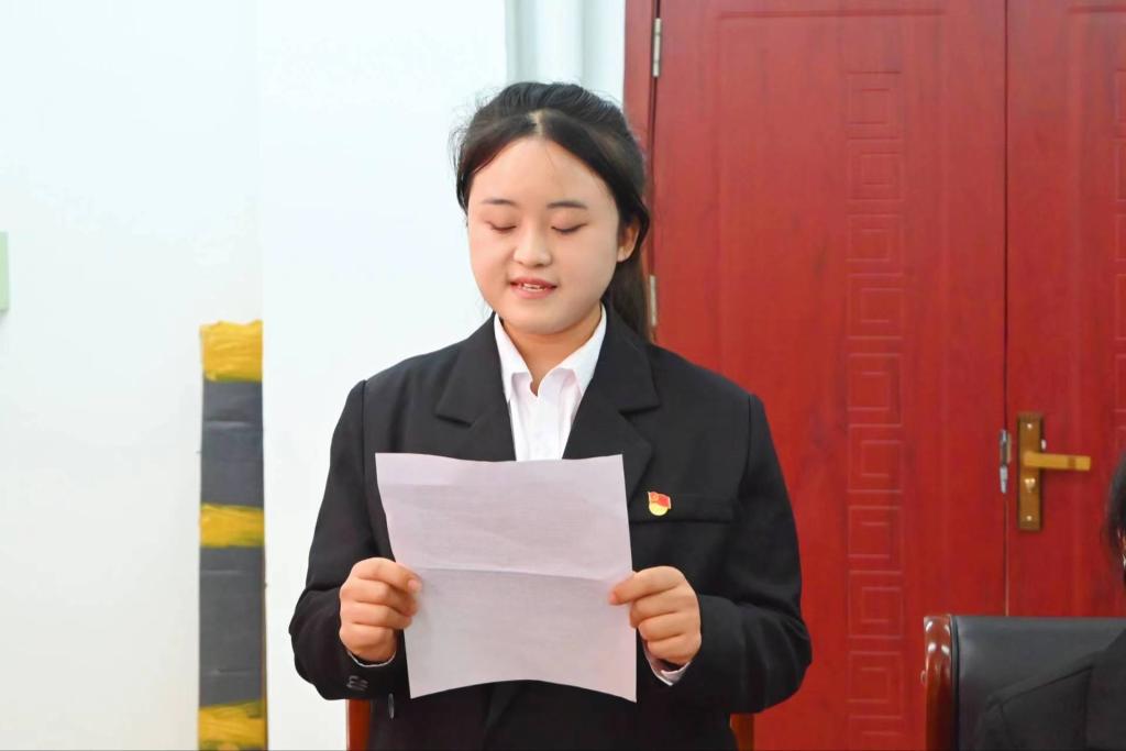 仪式第三项,由王鑫昕代表新接收的预备党员进行发言。她表示,“组织上入党一生一次,思想上入党一生一世”,不仅仅是从组织上入党,更要从思想上入党。在今后的日子里将会用党员的标准严格要求,对目前存在的不足和缺点加以改正,以更加饱满的热情投入到学习和工作中,自觉接受监督,以实际行动履行党员义务。并提到新时代的中国青年要以实现中华民族伟大复兴为己任,增强做中国人的志气、骨气、底气,不负时代,不负韶华,不负党和人民的殷切期望!
