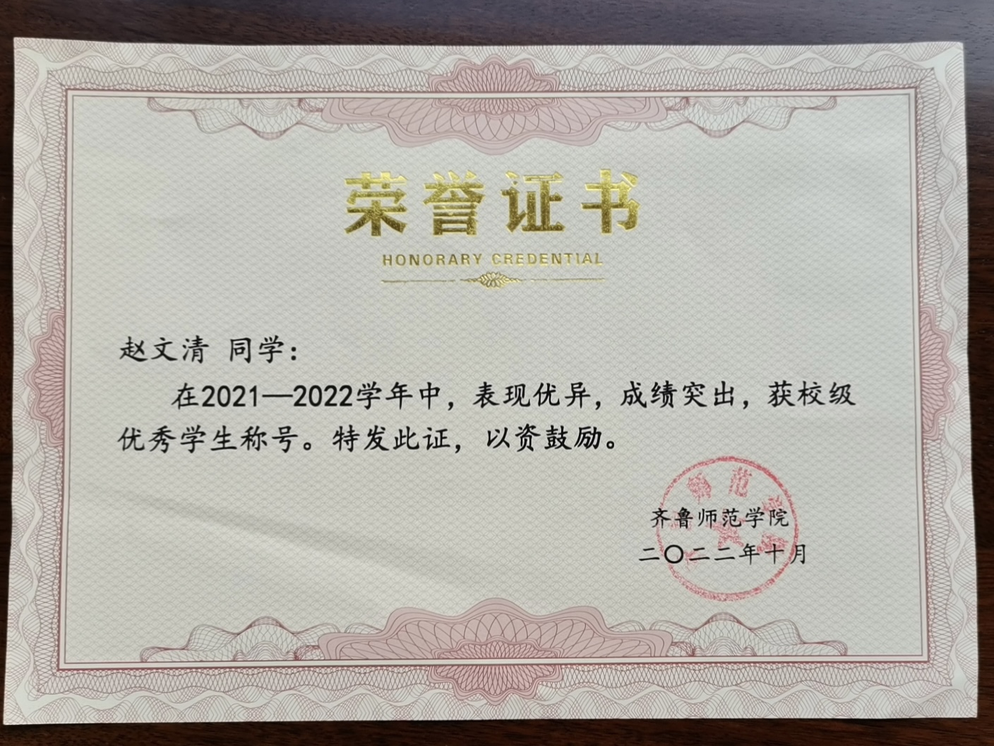 赵文清同志自入学以来,严格遵守学校的各种规章制度,认真踏实的干好每一件事,学习勤奋,成绩优异,积极参加各种校内外活动,在思想、学习、生活、个人实践等各方面都取得了较大的进步,一直以一个积极乐观,坚强自立,热心奉献社会的精神状态面对生活,以严以律己、认真负责、努力奋斗的标准要求自己。与党同行,初心不渝。长期以来该同志理想信念坚定,勇于担当作为,不忘初心使命,践行青春使命。思想方面注重道德修养,积极向党组织靠拢,不断学习,不断加强自身修养。只争朝夕,积极探索。在学习方面,该同志严格要求自己,勤奋好学,努力学好专业理论知识,不断地增加新知识,陶冶情操、开拓视野,在校期间荣获校级奖学金。热爱生活,提升自我。该同志积极参加各类比赛,追求热爱,大胆创新。于2021年参加了“颂歌献给党”山东省大学生合唱音乐节活动并取得了甲组一等奖的好成绩。踏实负责,善始善终。赵文清同志大三时任职学前教育学院学生会主席团成员。作为学生干部积极参加学校志愿服务,参与学院三年迎新与毕业工作等,发挥了党员的先锋模范作用。任职主席期间积极开展与策划院内文体活动、文艺晚会、才艺大赛、“525”心理健康节等活动。能够配合老师开展好各项工作,认真负责,善始善终,在校期间连续两年获得“校级优秀学生”。