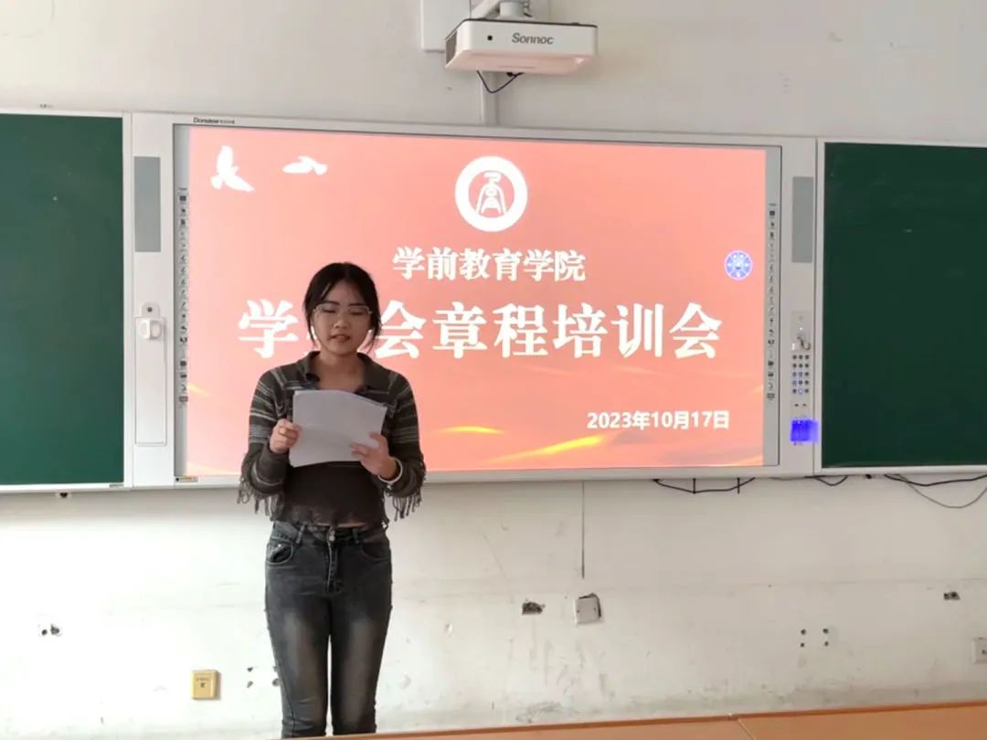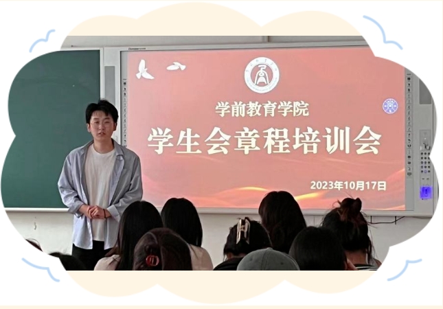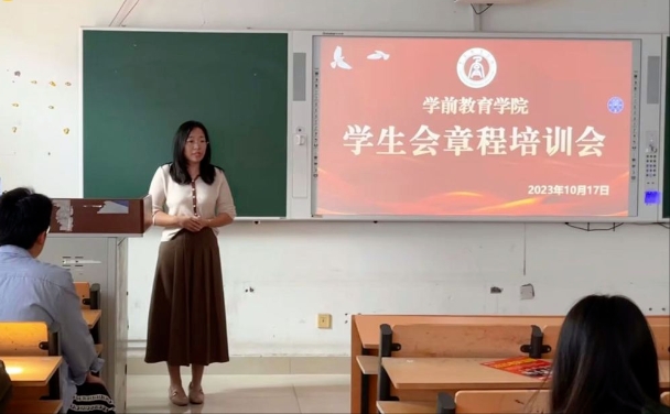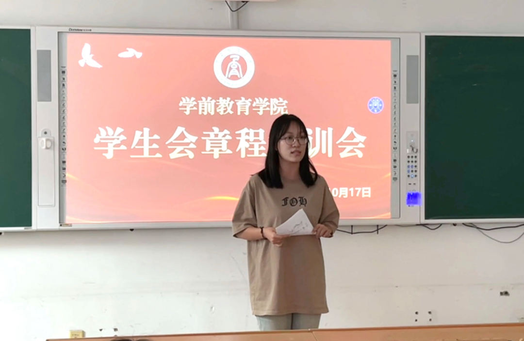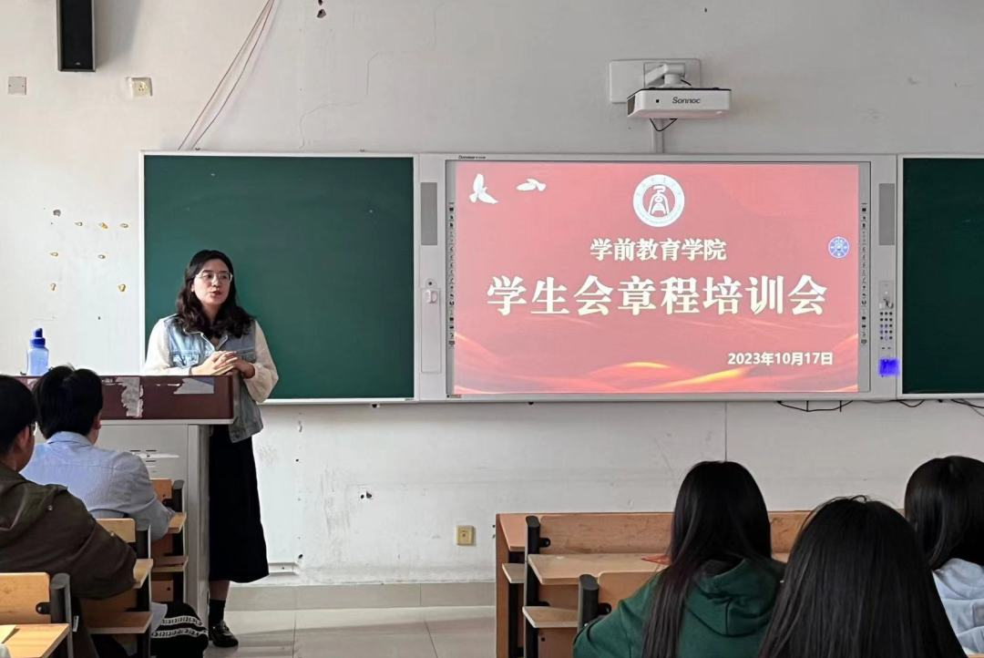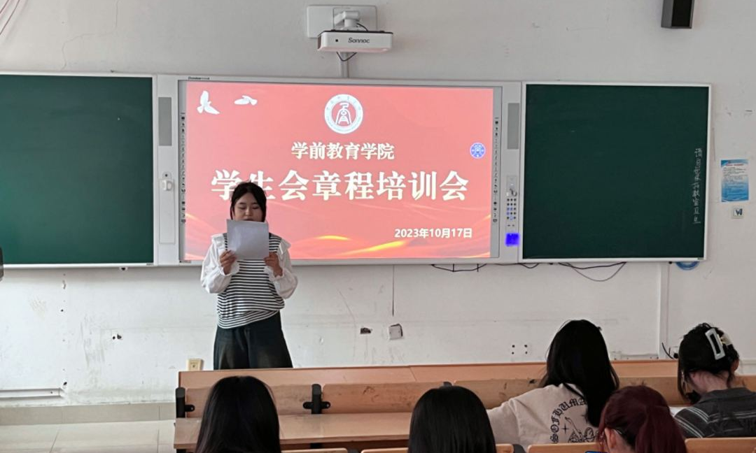 为更好地建设学生之家、师生之桥,加强学生会成员对自身职责的认识,提高办事效率,促进日常工作的开展,2023年10月17日12:10-13:00,我院于一教A217召开了学前教育学院学生会章程培训会。本次会议由学生会主席团成员李传科主持。