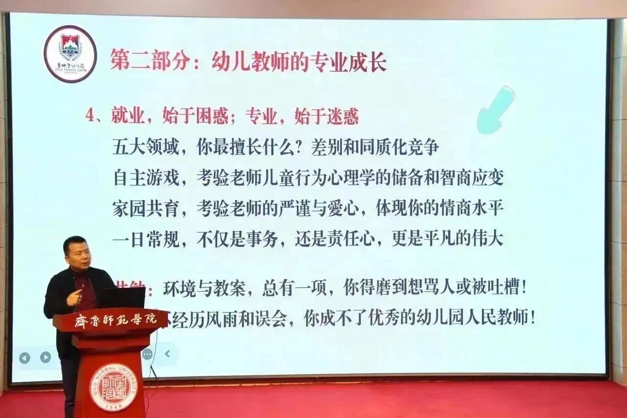 2023年11月10日,学前教育学院特邀童林堡幼儿园董事长刘合平于图书馆报告厅“从学前教育的发展趋势,谈幼儿教师的专业成长”专题讲座。学前教育学院院长常爱玲、党委副书记孙建凯、齐鲁师范学院2015届学前教育专业优秀毕业生邱杰园长出席本次讲座,2022级、2023级全体学生参加讲座。