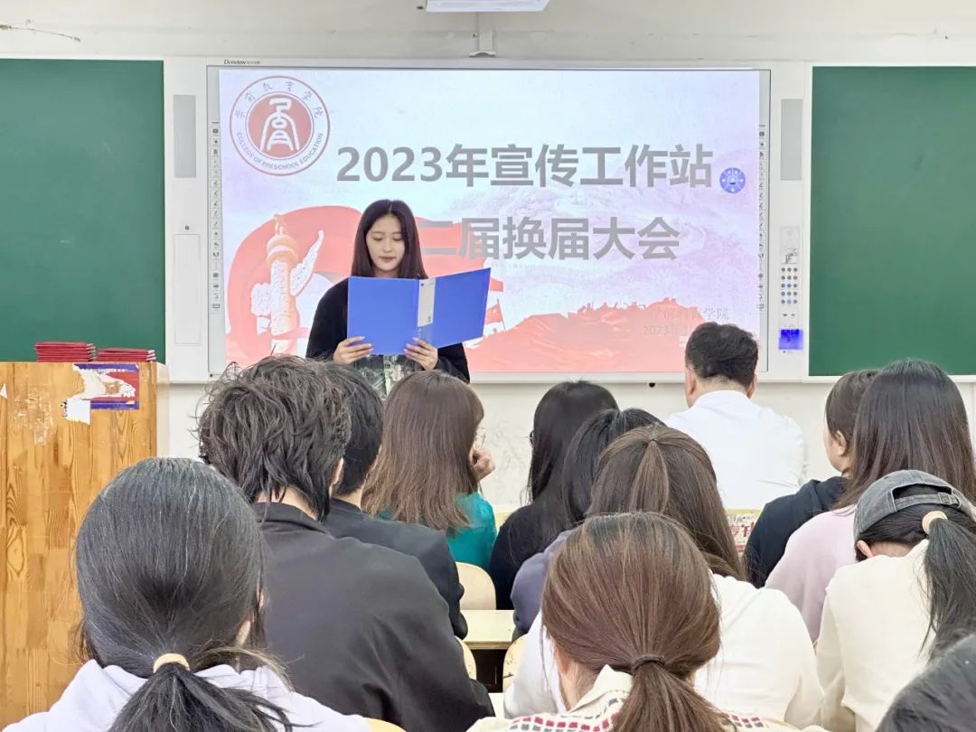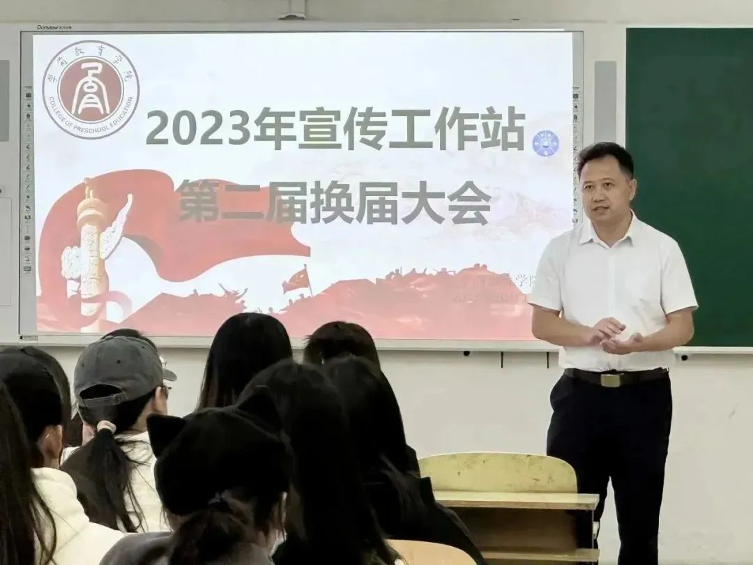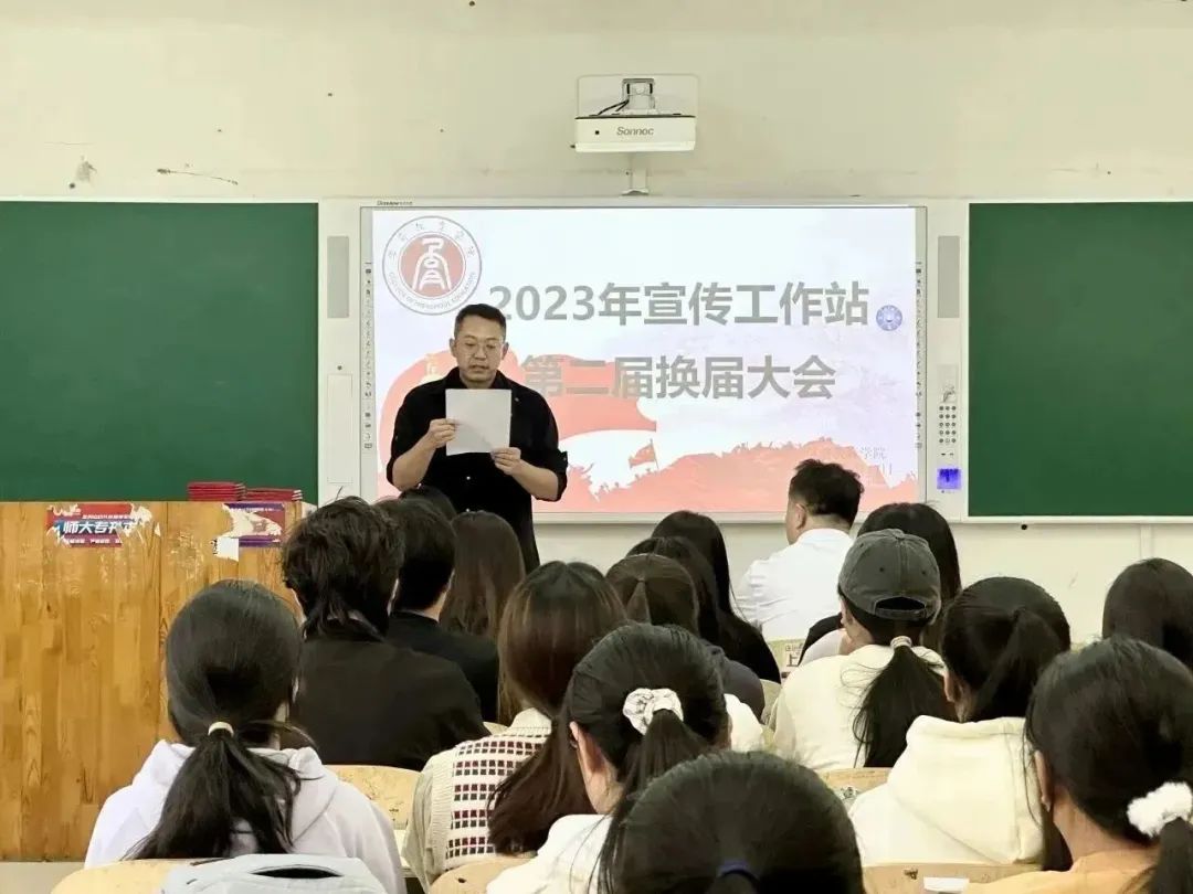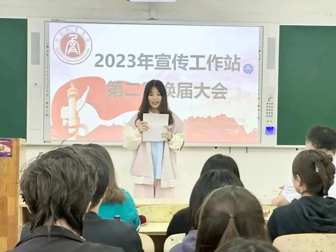 为注入新力量,满足宣传工作站更高效全面的发展,进一步提高宣传工作站内部的凝聚力和向心力,促进个人与集体的共同发展,宣传工作站于2023年10月17日12:30在二教A106召开学前教育学院宣传工作站换届大会,出席本次大会的有学前教育学院党委书记郑海斌、团总支书记郭飞、团总支副书记田蕾、辅导员林芳、李文、刘翱源、孙超越,第一届宣传工作站主要学生干部以及第二届宣传工作站全体成员,本次宣传工作站换届大会由第一届主席团成员韩淋伊主持。