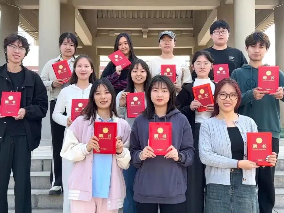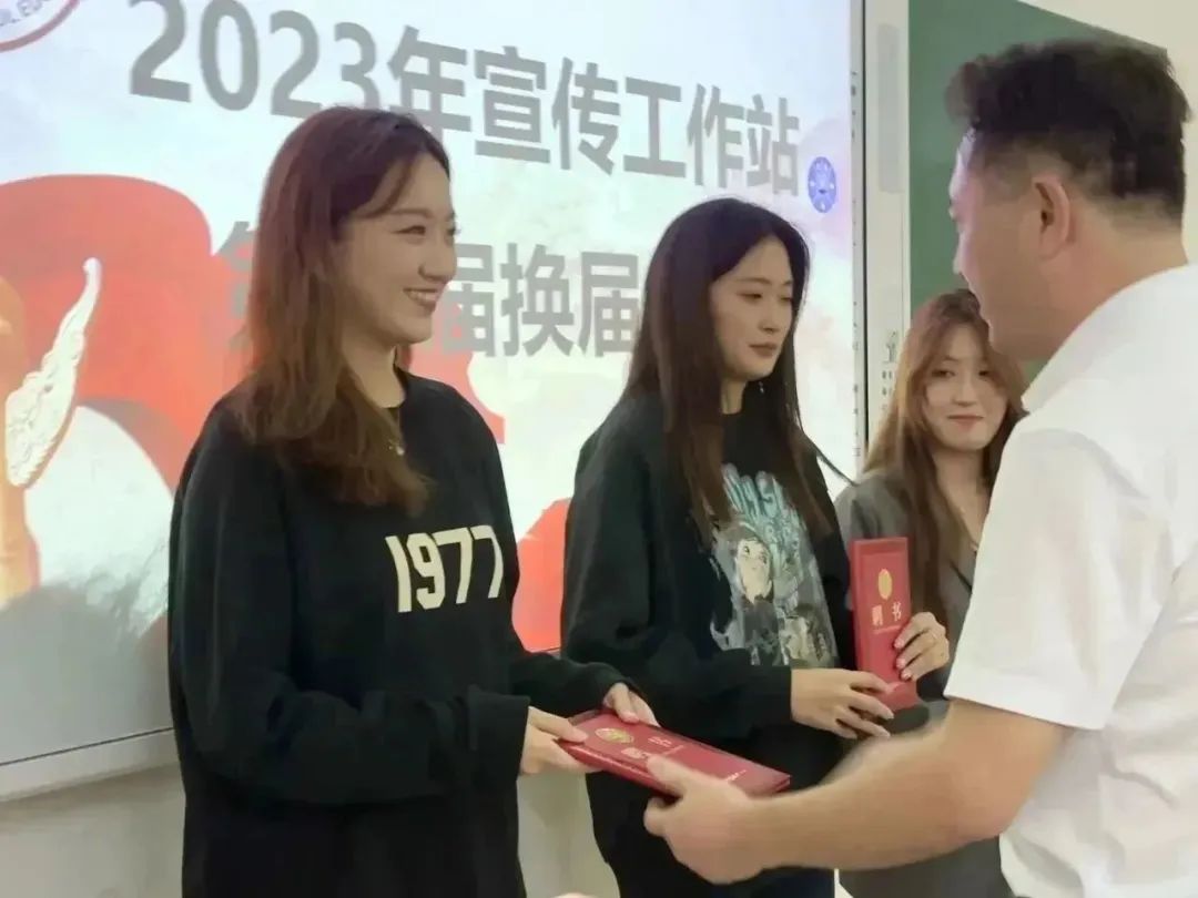 大会第三项,由党委书记郑海斌为第一届宣传工作站主席团成员颁发聘书,团总支书记郭飞为第一届宣传工作站部门负责人颁发聘书。这份红皮聘书意义非凡,它有对前人的鼓励,也激励后人再接再厉,赓续传统,守正创新。