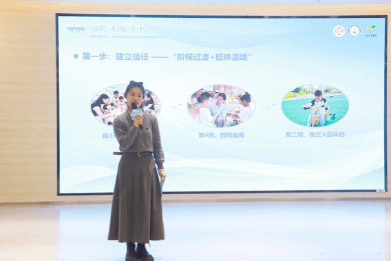 百合幼教集团总园长丁文分享了“情感护心、空间润心、行为暖心”的三维照护标准。丁园长将开设托班的规划-建设-实践的全过程进行了标准化梳理,为托育一线从业者提供了宝贵借鉴,引发了与会者的热烈反响。托班教师刘丹丹则围绕“回应式照料构建幼儿安全依恋”,结合真实案例为大家展现出托幼一体化中“专业照护”与“柔软呵护”的双重力量。