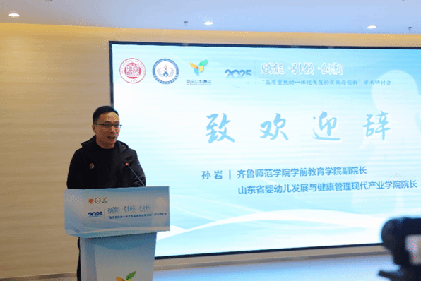 上午10:00会议正式开始,开幕式上,山东省婴幼儿发展与健康管理现代产业学院院长、齐鲁师范学院学前教育学院副院长孙岩发表了热情洋溢的欢迎致辞。他指出,产业学院正通过“师徒制”、“跟岗学习”、“参与式观察”等多元化模式,有效促进学生在理论与实践的深度融合,为托幼一体化建设在人才培养、师资培训、课程研发乃至社会服务等全链条环节提供坚实的人才支撑。