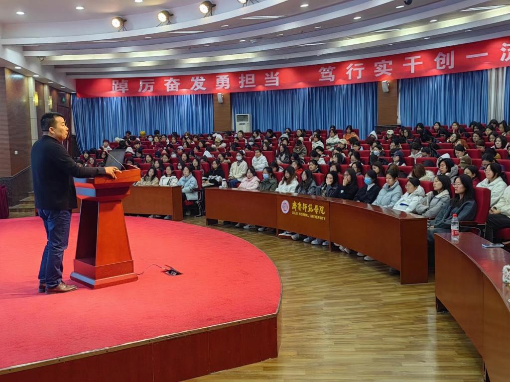2023年11月10日,学前教育学院特邀童林堡幼儿园董事长刘合平于图书馆报告厅“从学前教育的发展趋势,谈幼儿教师的专业成长”专题讲座。学前教育学院院长常爱玲、党委副书记孙建凯、齐鲁师范学院2015届学前教育专业优秀毕业生邱杰园长出席本次讲座,2022级、2023级全体学生参加讲座。