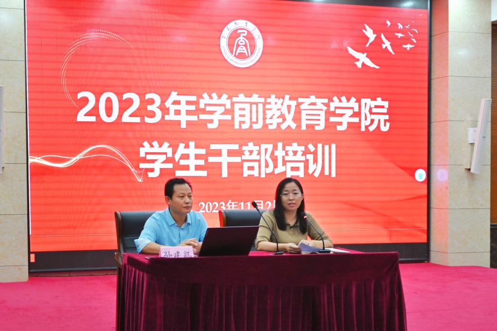 为加强学生干部教育管理,增强学生干部“自我教育、自我管理、自我服务、自我监督”的意识和能力,全面提升学生干部的综合素质,学前教育学院举办学生干部培训。按照学院学生干部培训计划,11月2日晚,由学院党委副书记孙建凯为学院学生干部作培训讲座。学院部分辅导员和学院学生会、宣传工作站、学院社团及2022级和2023级班级学生干部参加培训会。培训会由团总支书记郭飞主持。
