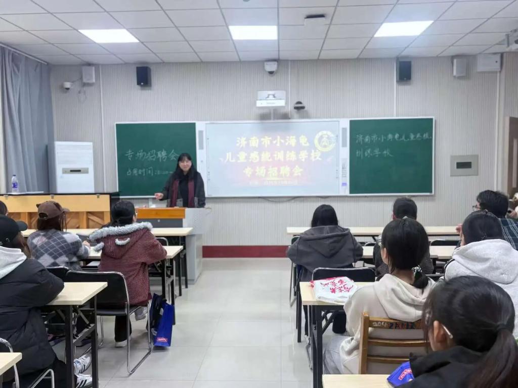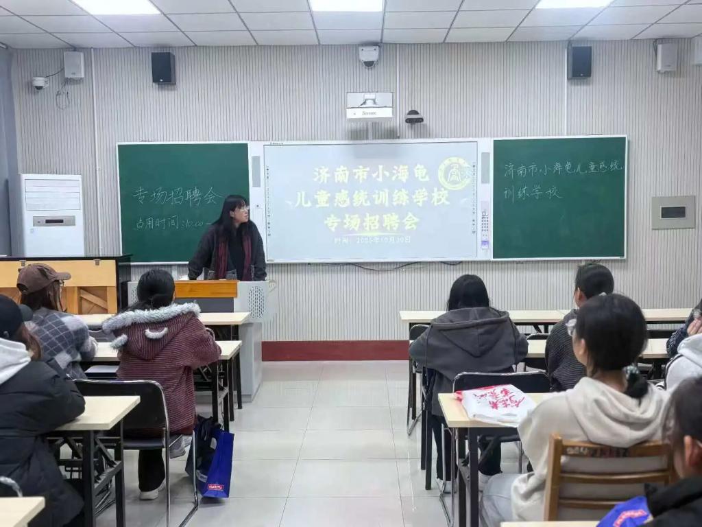 为深入贯彻落实党中央关于促进高校毕业生就业的决策部署,切实为我校毕业生与优质用人单位搭建精准、高效的对接平台,全力护航学子实现高质量就业,我院于10月30日10:30在二教A112教室成功举办了“济南市小海龟儿童感统训练学校”专场招聘活动。此次招聘会吸引了众多对儿童教育、特殊教育及康复训练领域感兴趣的应届毕业生参与,现场气氛热烈,互动交流深入。