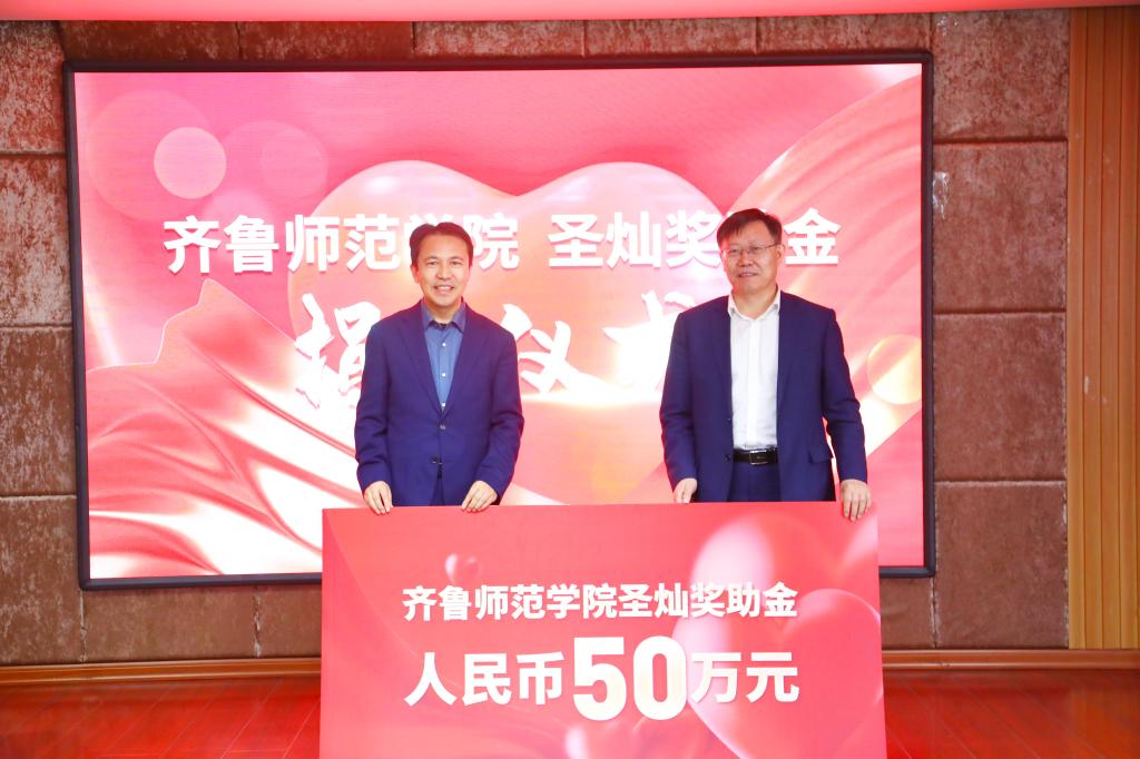 林松柏接受齐鲁师范学院杰出校友、琛蓝健康产业集团董事长邹圣灿捐赠的“齐鲁师范学院圣灿奖助金”。
