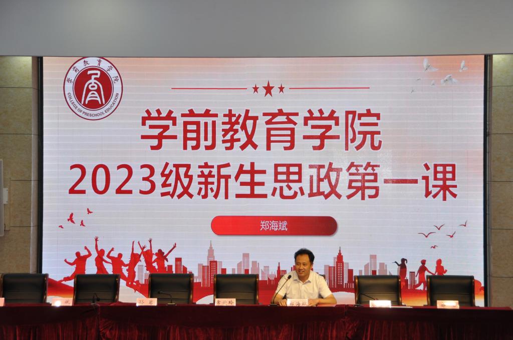 郑海斌为2023级新生讲授“思政第一课”。他指出,新时代的学生们要做到胸怀格局、心有敬畏、脚踏实地、崇德尚能。他强调,同学们应正确认识新时代发展形势,深刻认识教育强国建设任务,正确定位大学发展阶段要求,牢记“明德仁爱,行端表正”的院训,努力提高身的综合素质和专业素养。他指出,应在自律自省中不断提升自我,收获知识增长才干,收获友谊获得认可,努力为学前教育事业优质发展打牢基础、贡献力量。